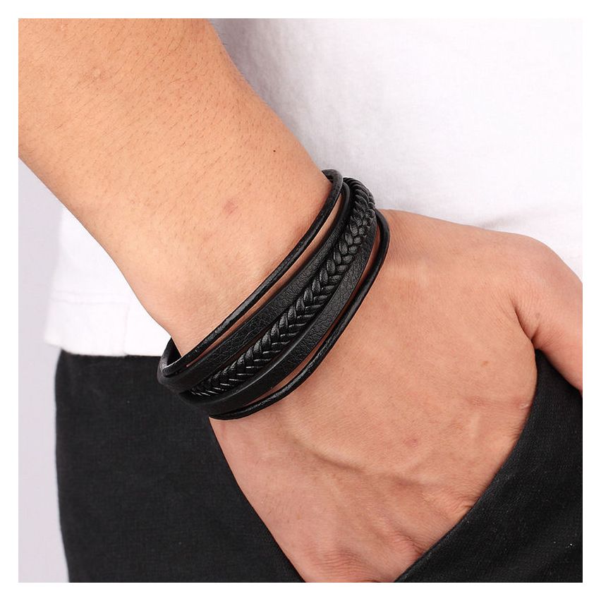 Titanium Steel and Black Leather Bracelet