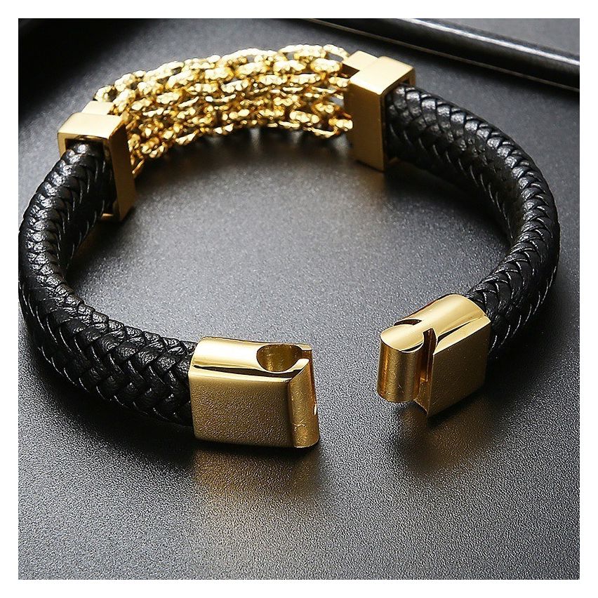 Titanium Steel and Black Leather Bracelet