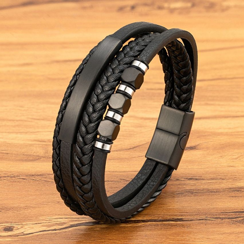 Titanium Steel and Black Leather Bracelet